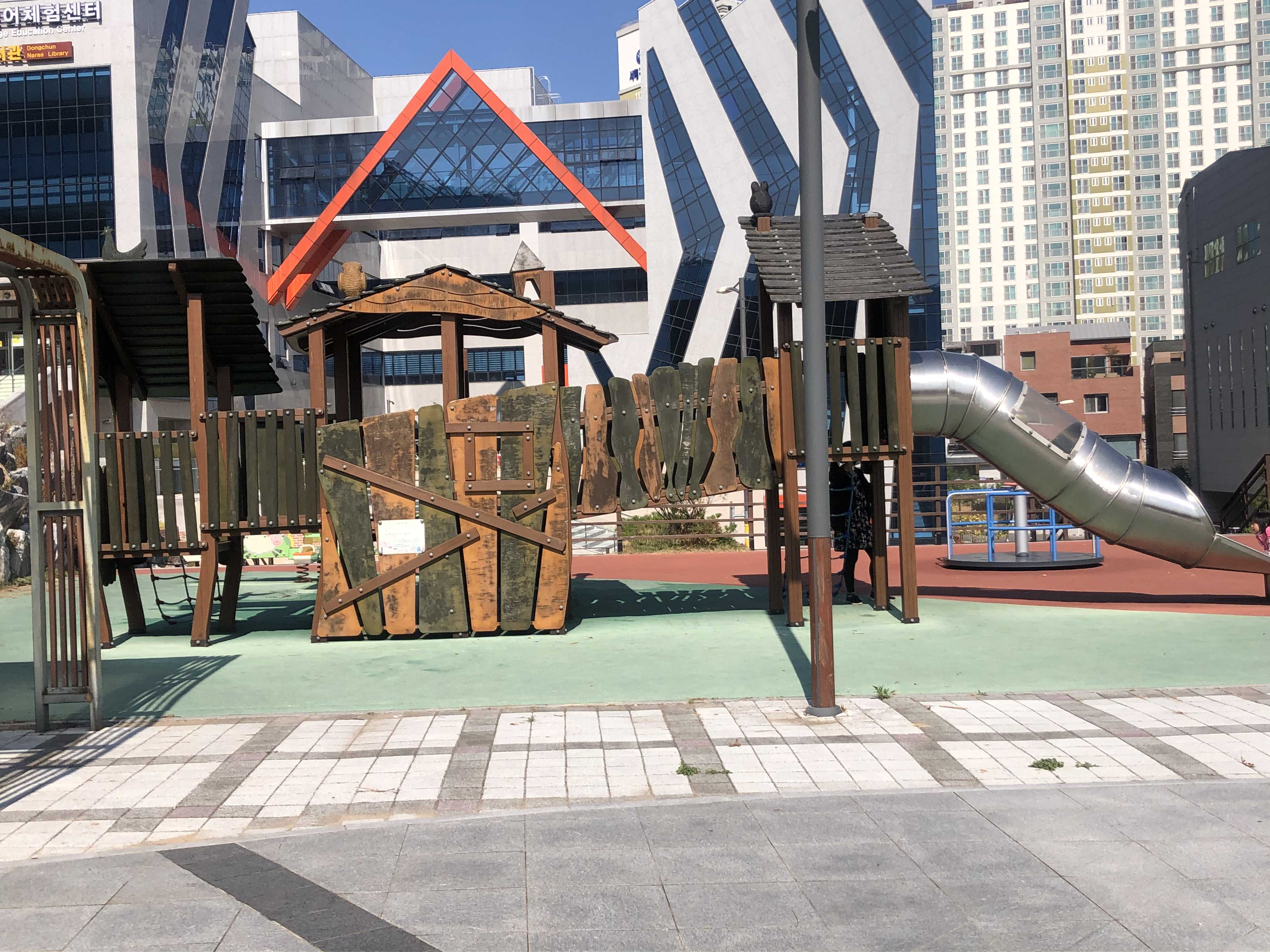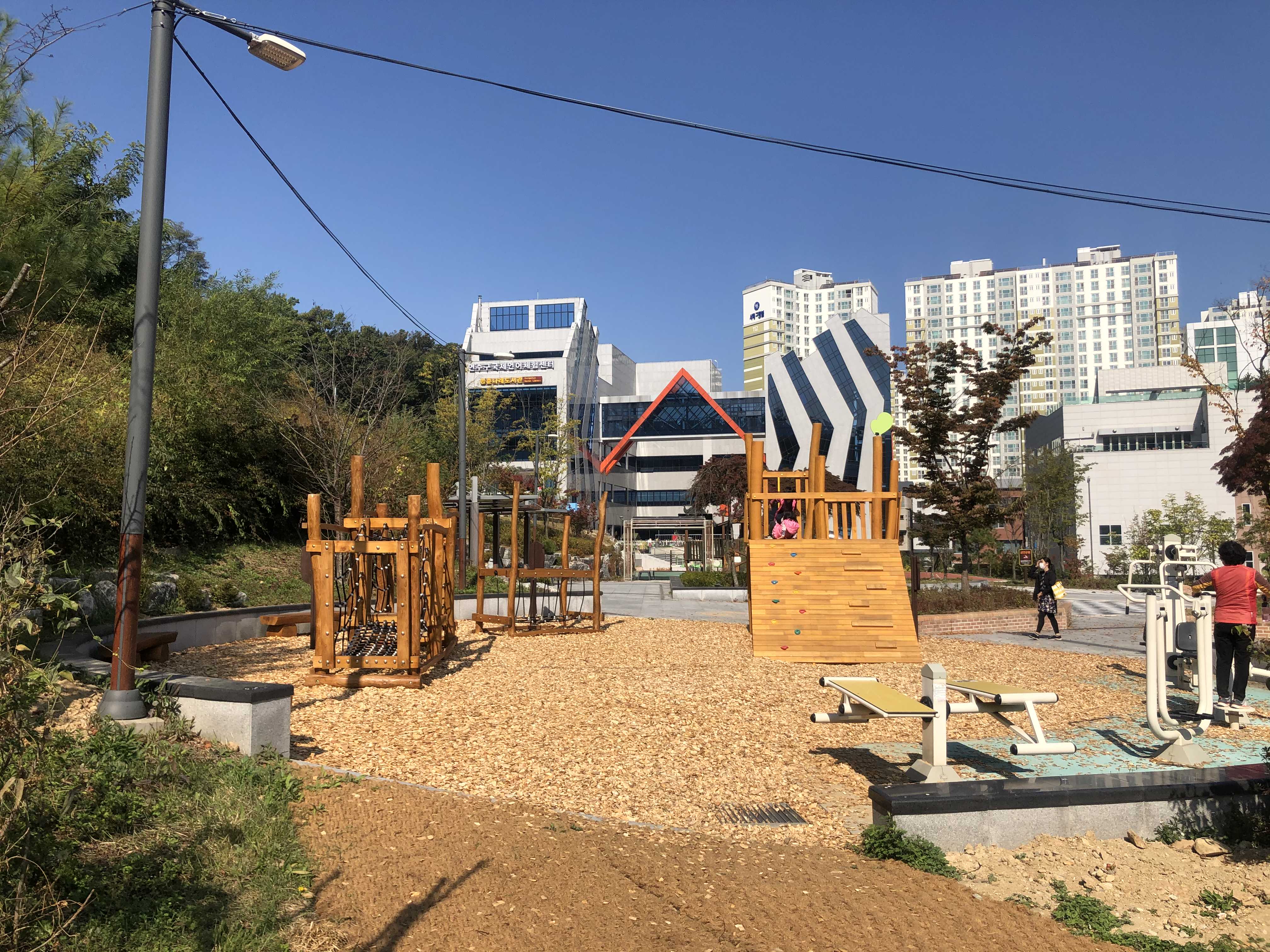 놀이터는 흙이 아닌 나무조각으로 조성되어 푹신해서 아이들이 다치지 않고 잘 놀수 있을것 같습니다.