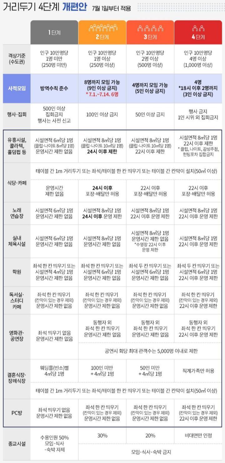 수도권은 7월 12일부터 7월 25일 2주동안 거리두기 4단계로 유지됩니다.