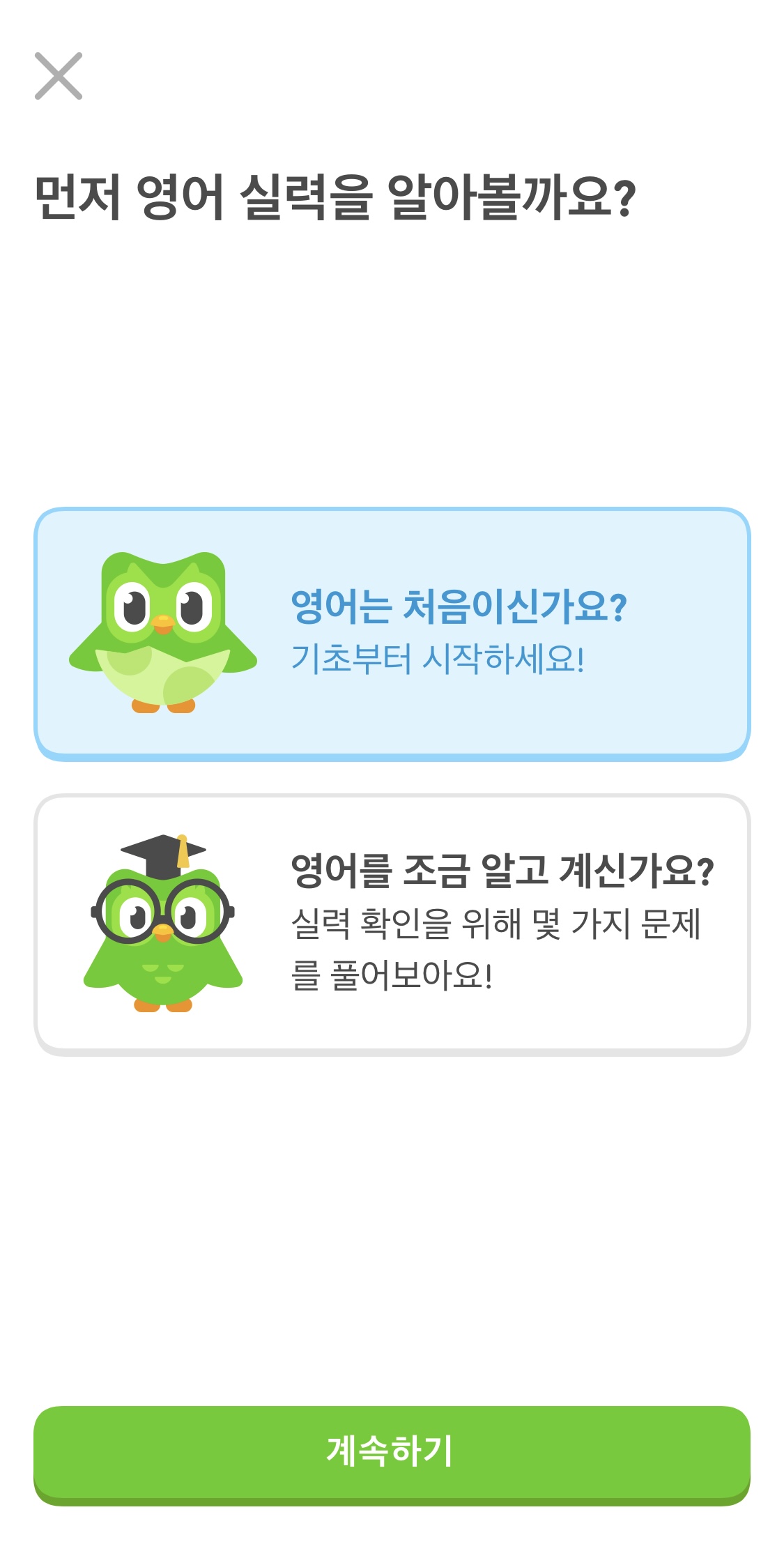 먼저 어플에 들어가면 배우고 싶은 언어를 선택하면 목표와 실력을 확인합니다.