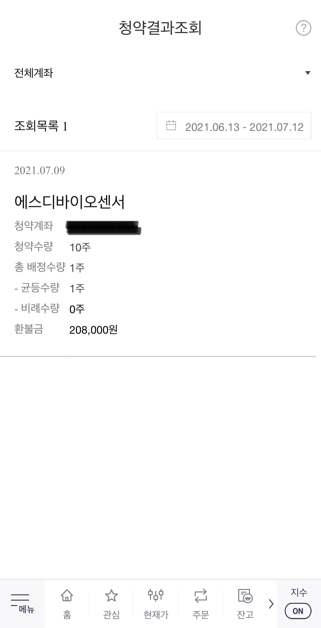 오늘 오전 에스디바이오센서 청약 결과가 발표되었는데요. 저도 어플에 들어가 확인해 보았습니다.