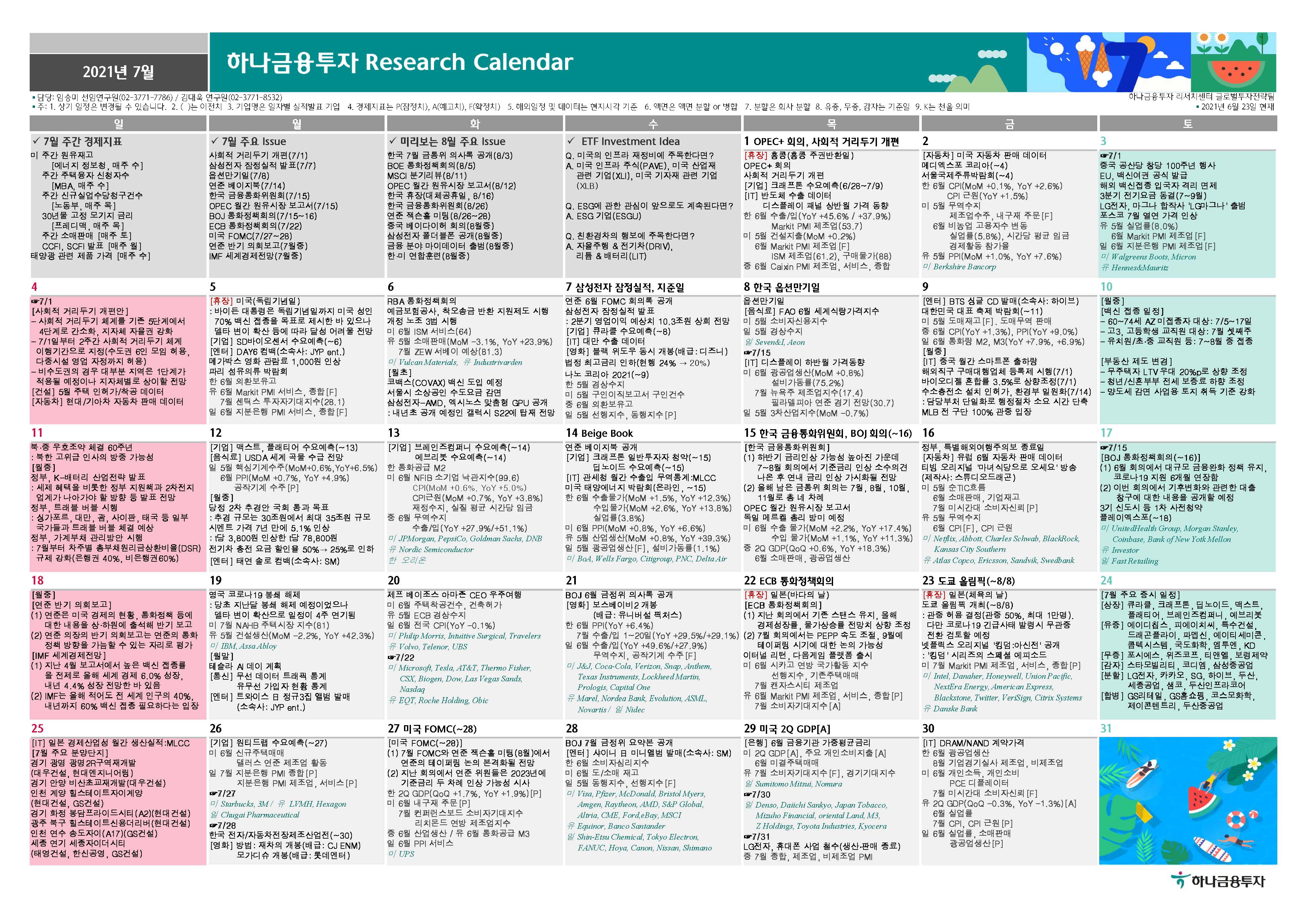 7월 주요 이슈와 증시 전망을 정리해 놓은 캘린더입니다.